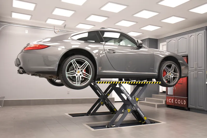 A Car lift for home garage allows homeowners to stack vehicles or create working clearance underneath a raised car. This vertical expansion is often more cost-effective than building a larger garage.